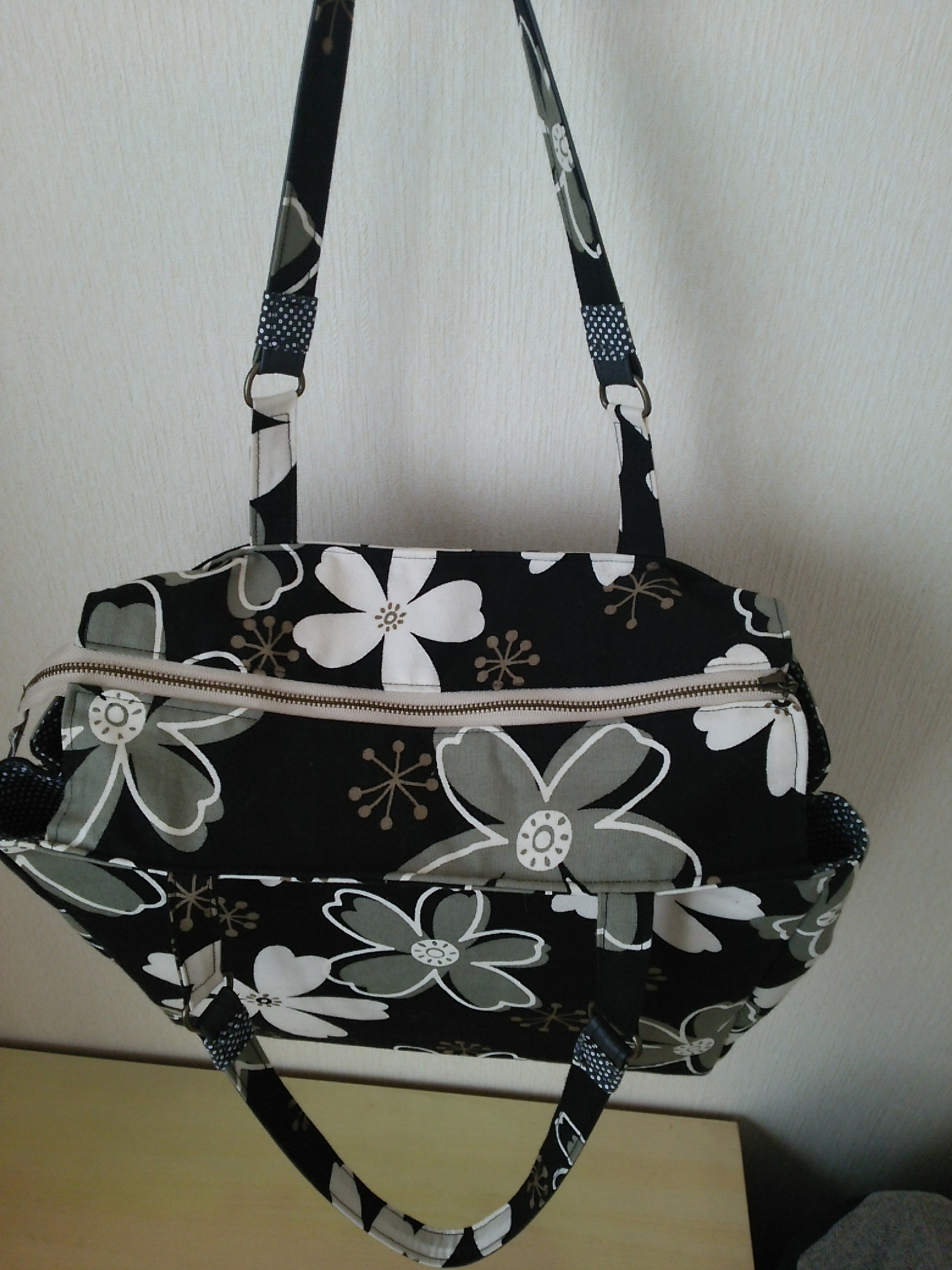 一つ目は別マチトートが基本です。黒の花柄生地でファスナー口布付きでシンプル&シックにしました。