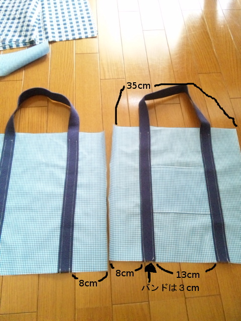 ポケットは下部を縫い付けて、持ち手で両端を押さえる感じに縫い付ける。