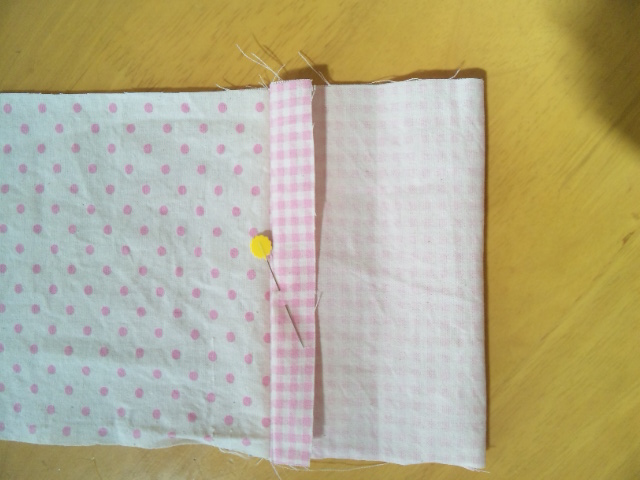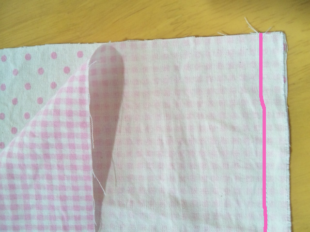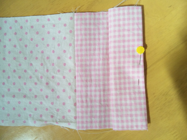 そして2cm縫い代部分を表布(チェック)の端へ合わせて折り返す。