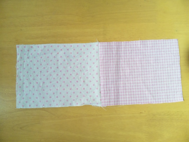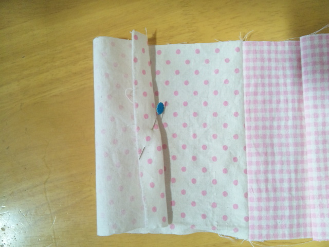 ②裏布を下にして、中表になるように短い面の1cm縫い代で縫い合わせる。