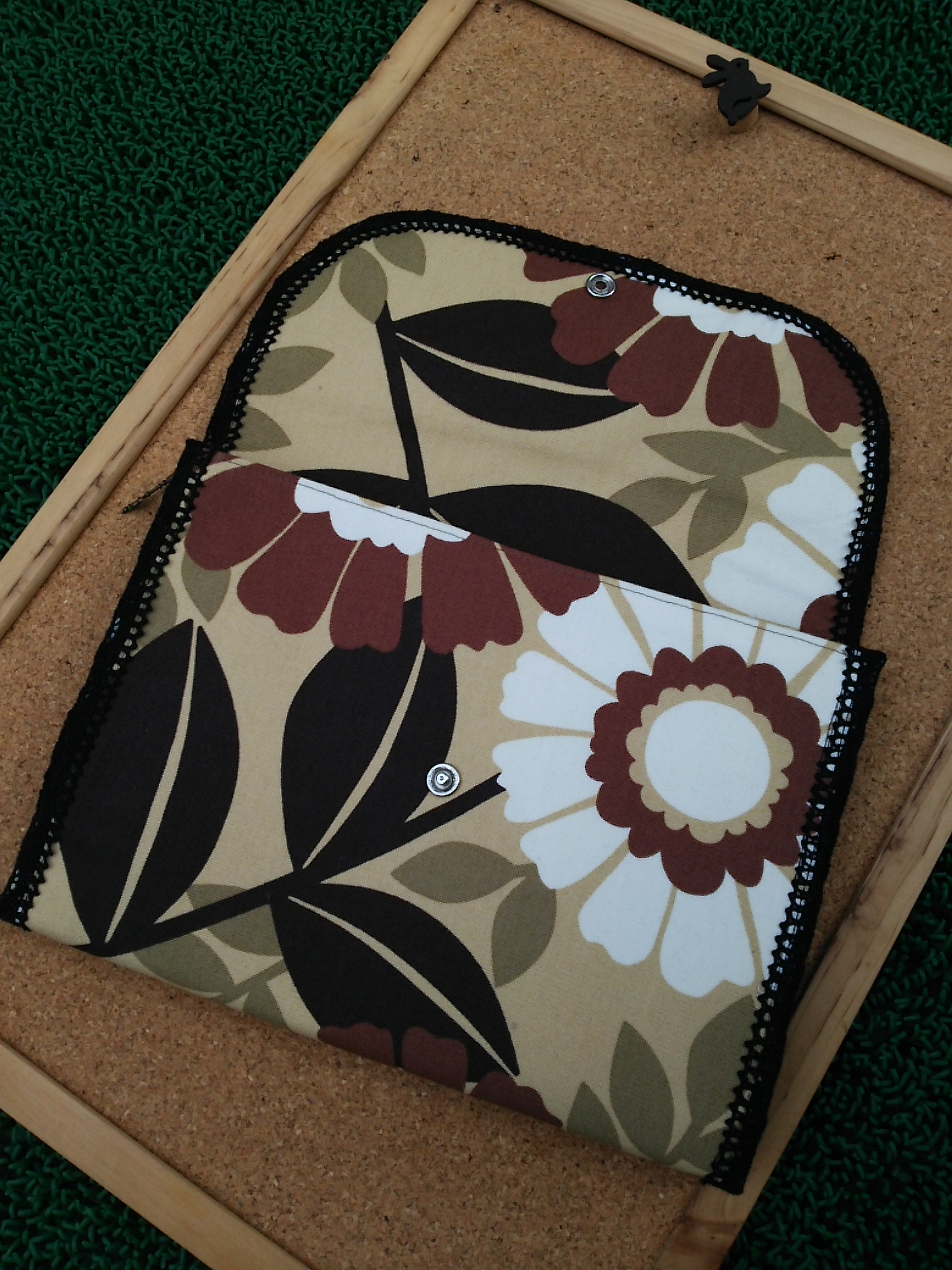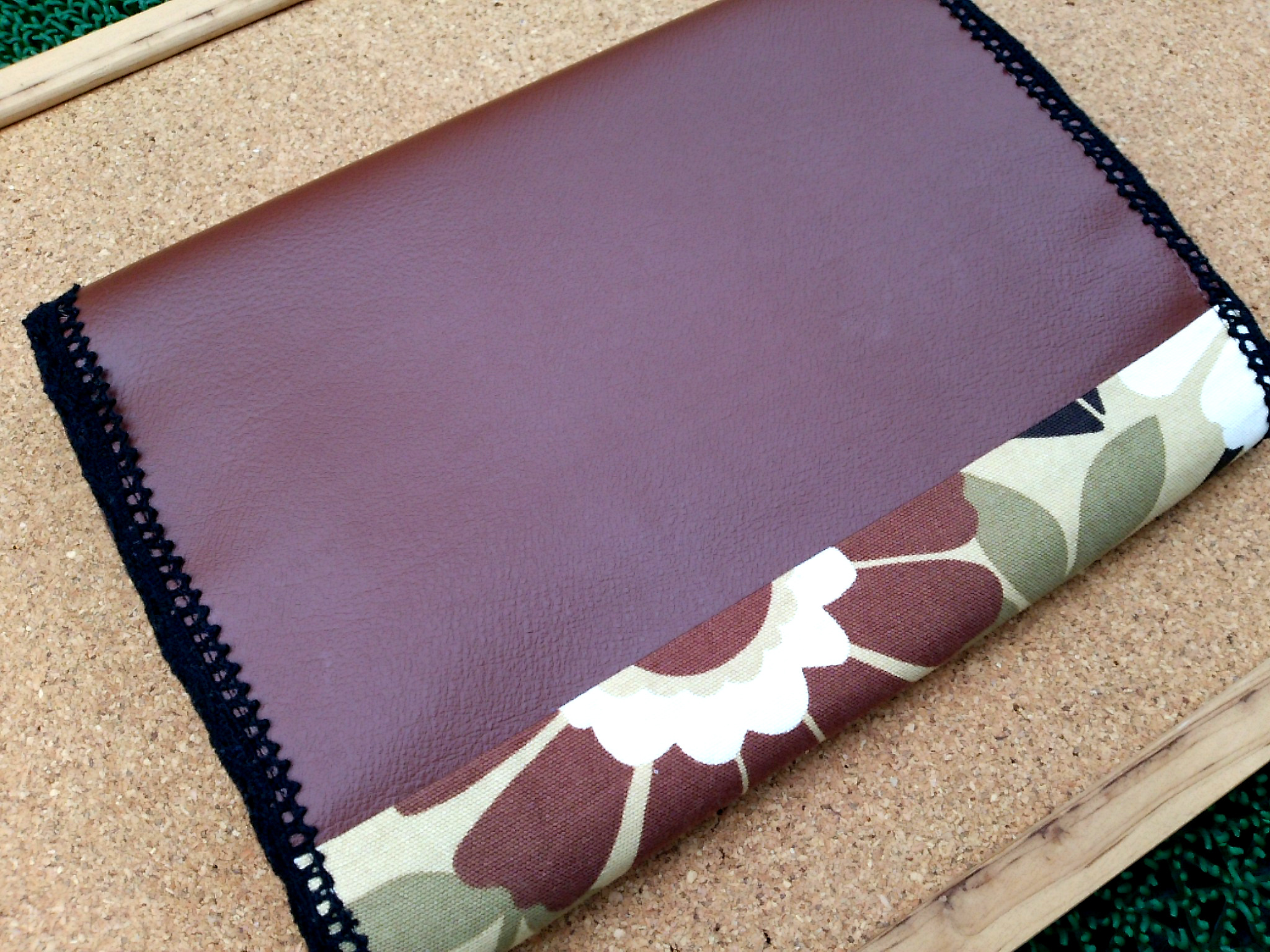 ベージュの大きな花柄にコゲ茶色の合皮を合わせ、黒のレースで綴じました。