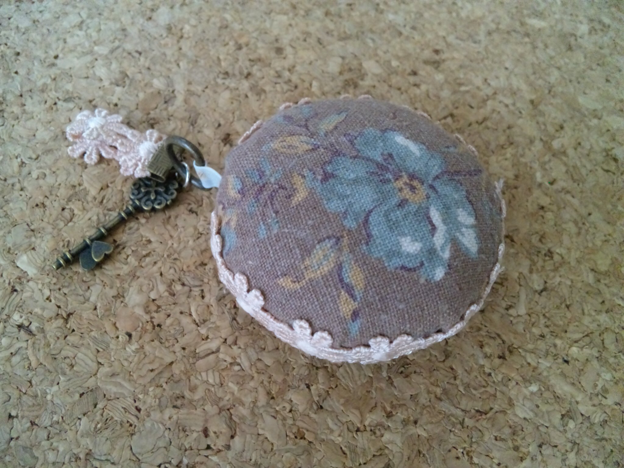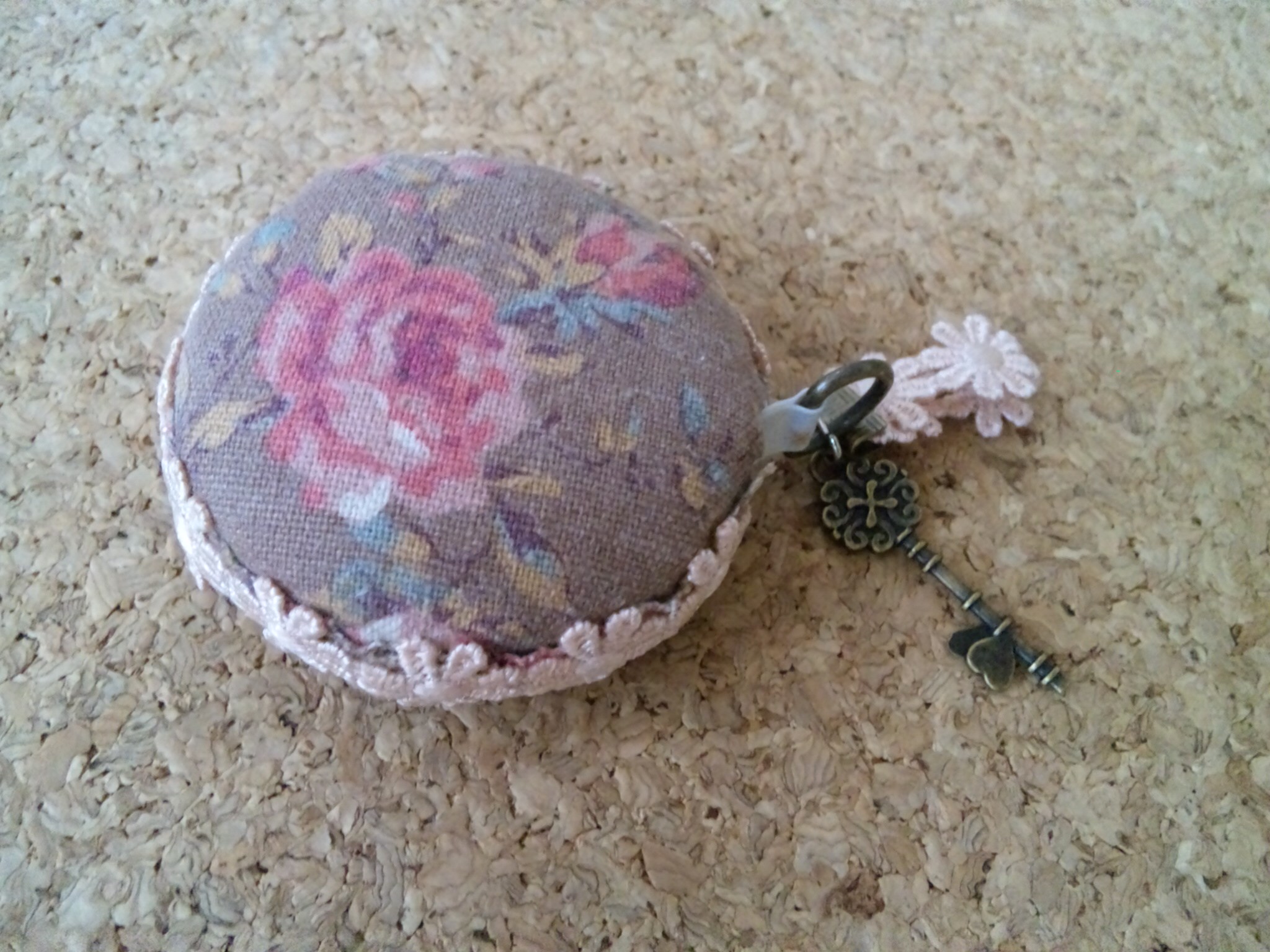 そしてそのリボンをこの間Seriaで買ったレース止め具で挟んで、やっぱりSeriaで買った(しつこいw)キーチャームと一緒にくっつけてみました。