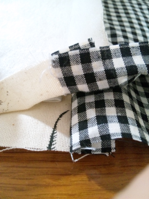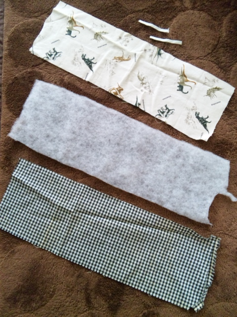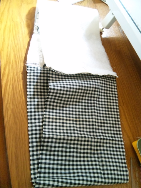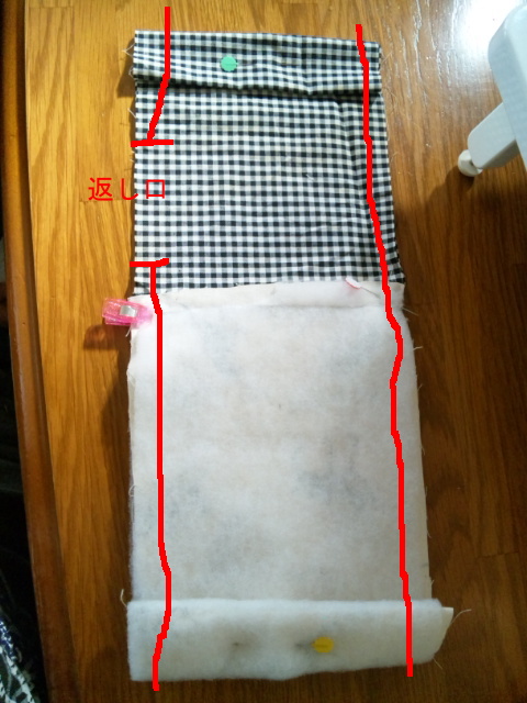 ②キルト芯→表布(上が表)→裏布(下が表)の順に(中表ってやつ)の順に乗せ、両脇を縫います。
