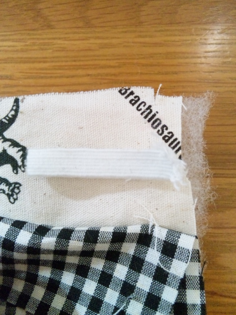 その時引っ掛ける用のゴムを半分に折って一緒に縫いこみます。