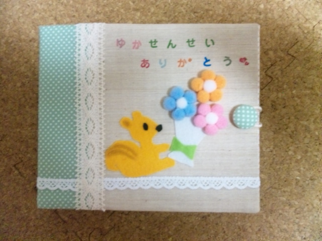 りすくんと花束はフェルトで、お花部分はボンボンで作ってあるので立体的♪