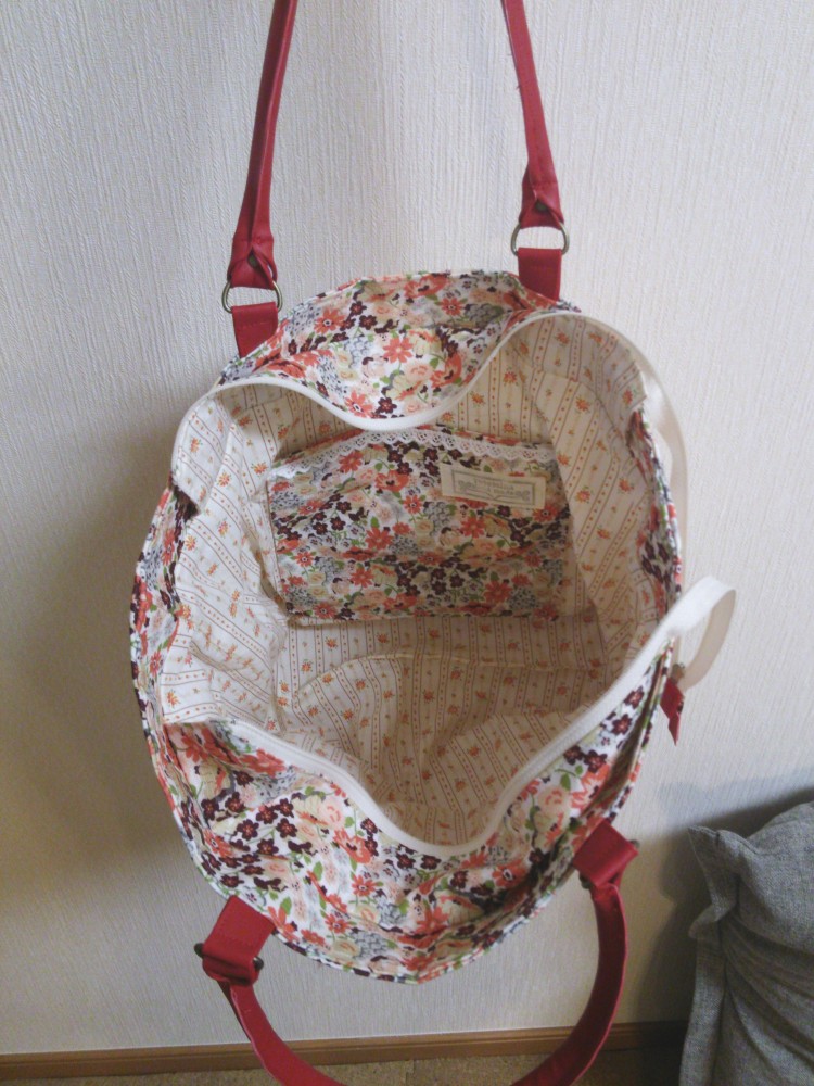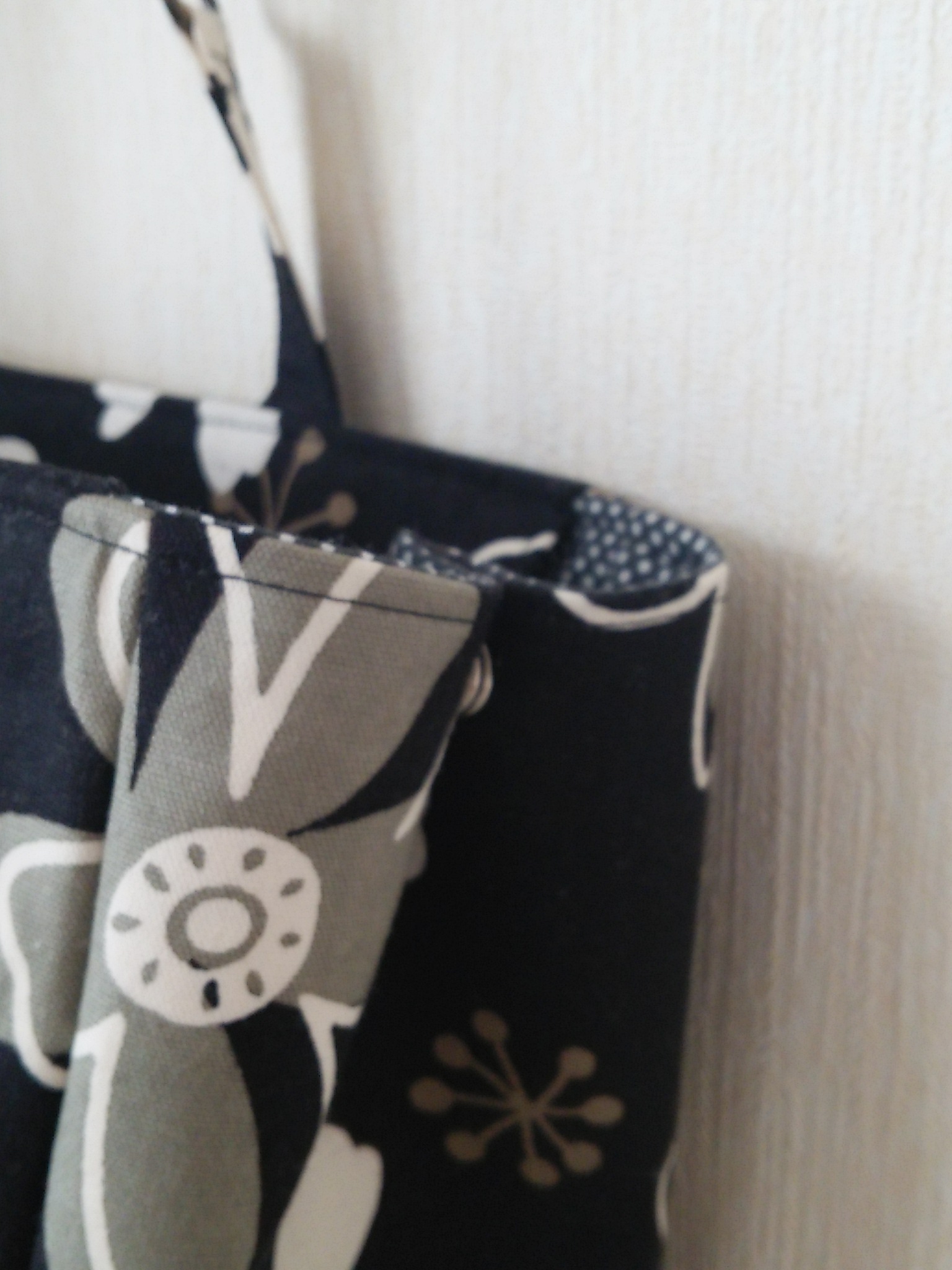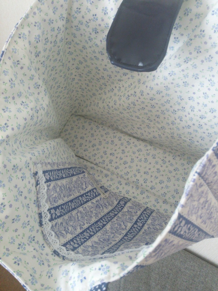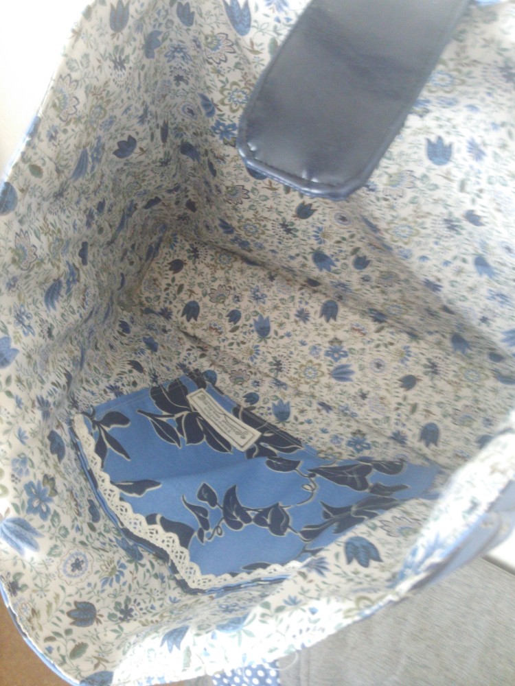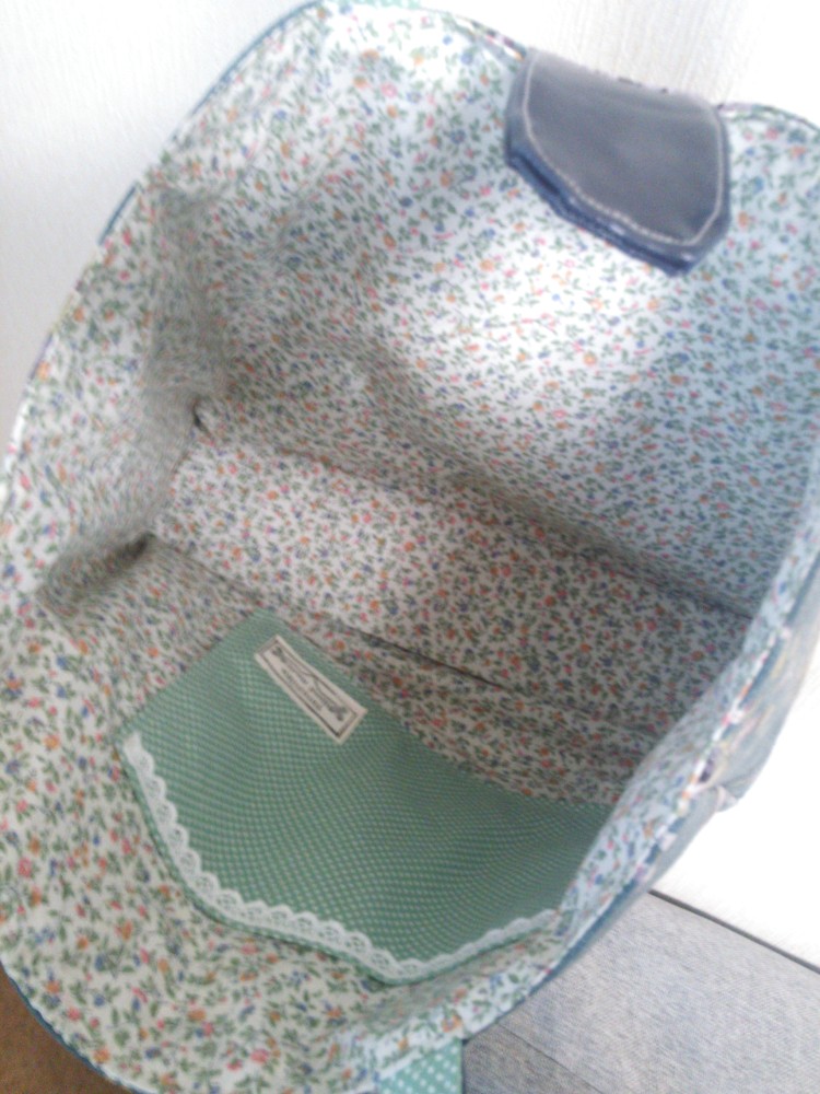 中&巾着部分は小花柄で、折り込むと普通のトートっぽくなります。