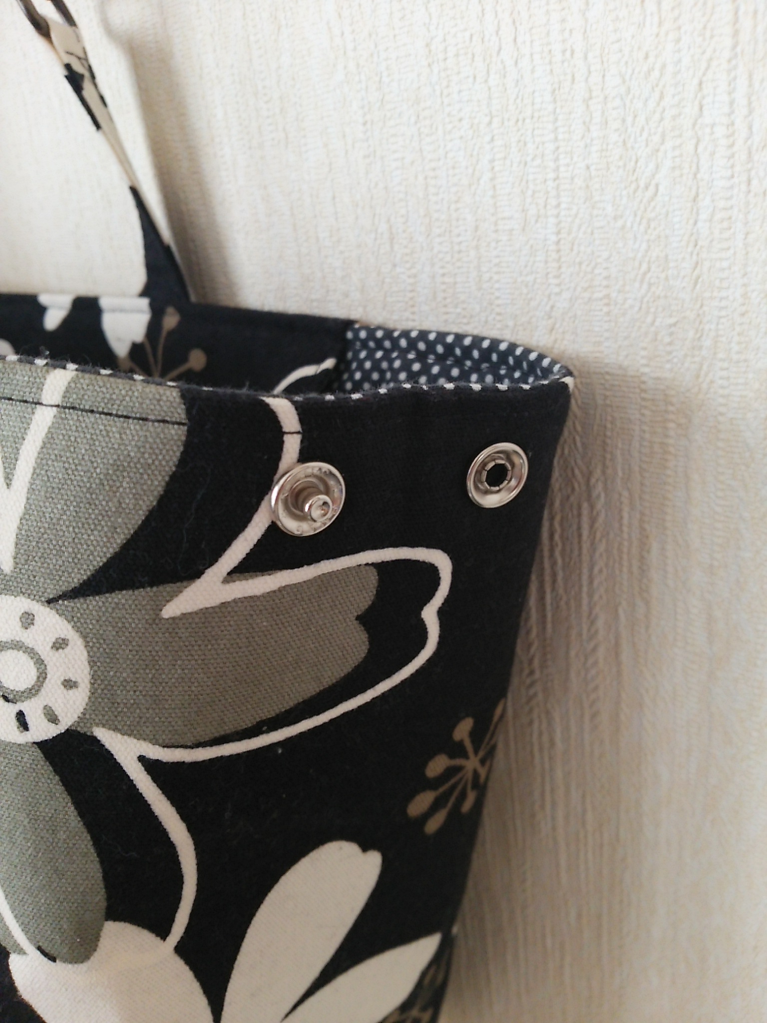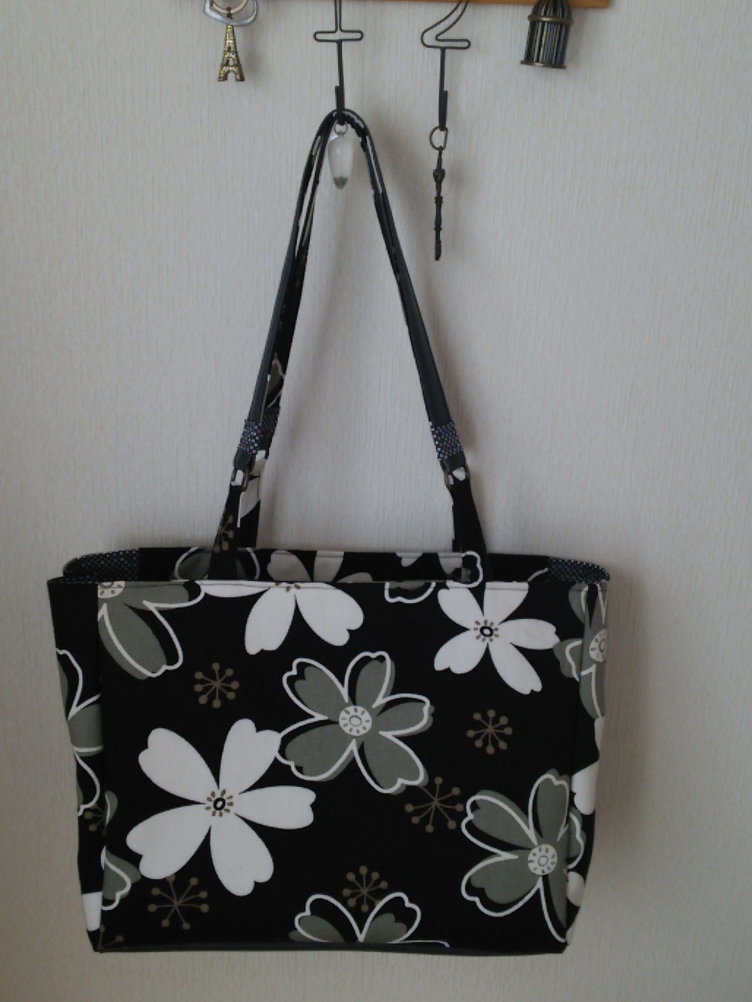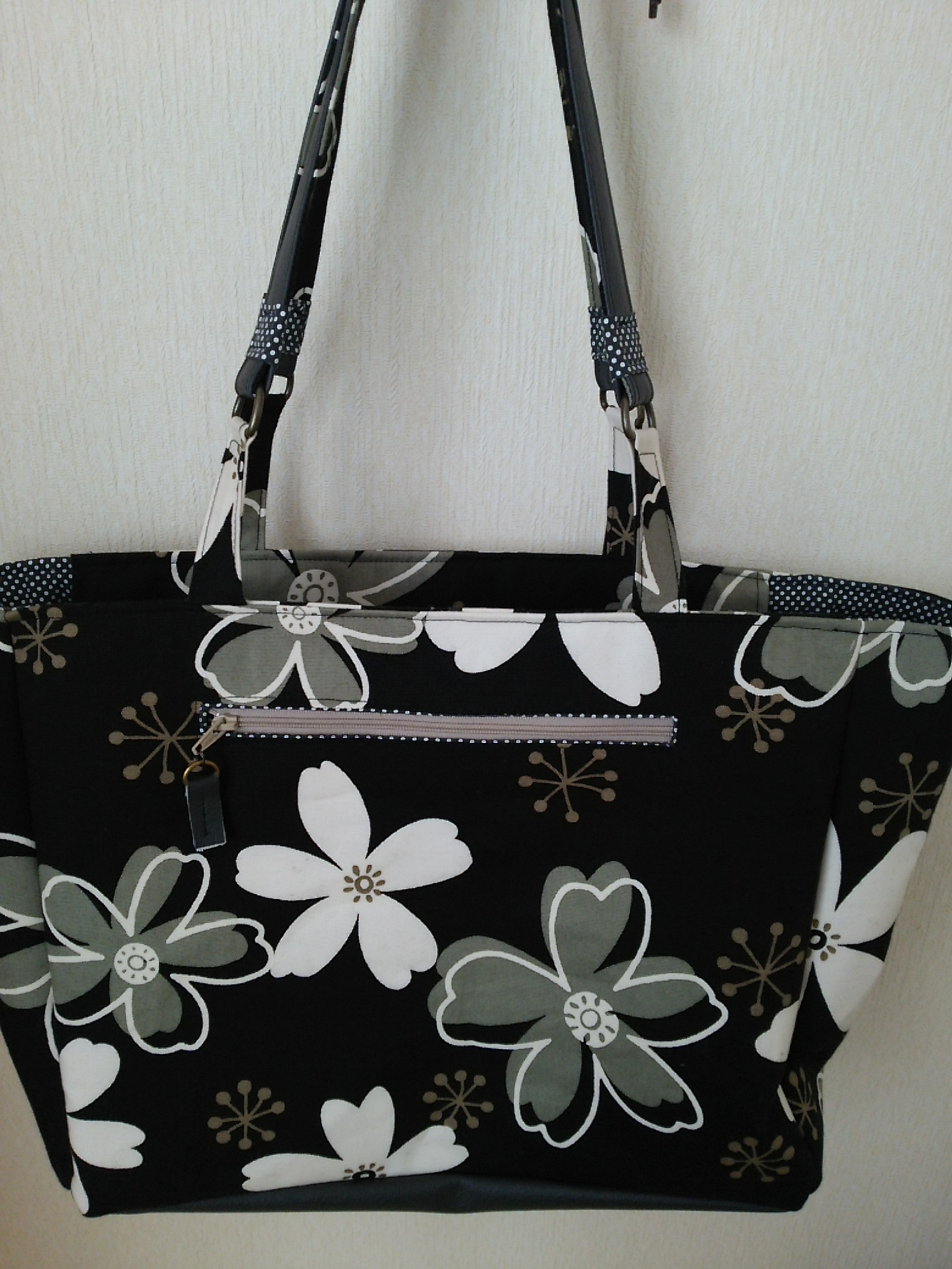 一つ目は別マチトートが基本です。黒の花柄生地でファスナー口布付きでシンプル&シックにしました。