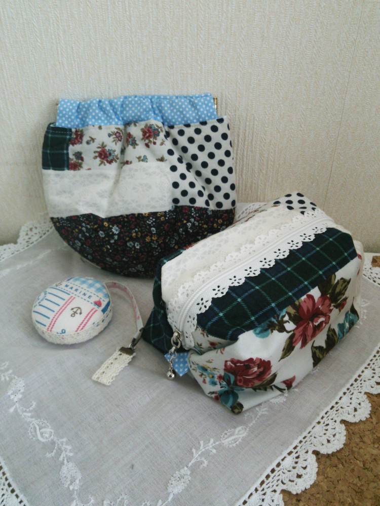 丸い12cmバネポーチ、20cmファスナーキャラメルポーチ、マカロンメジャーです。