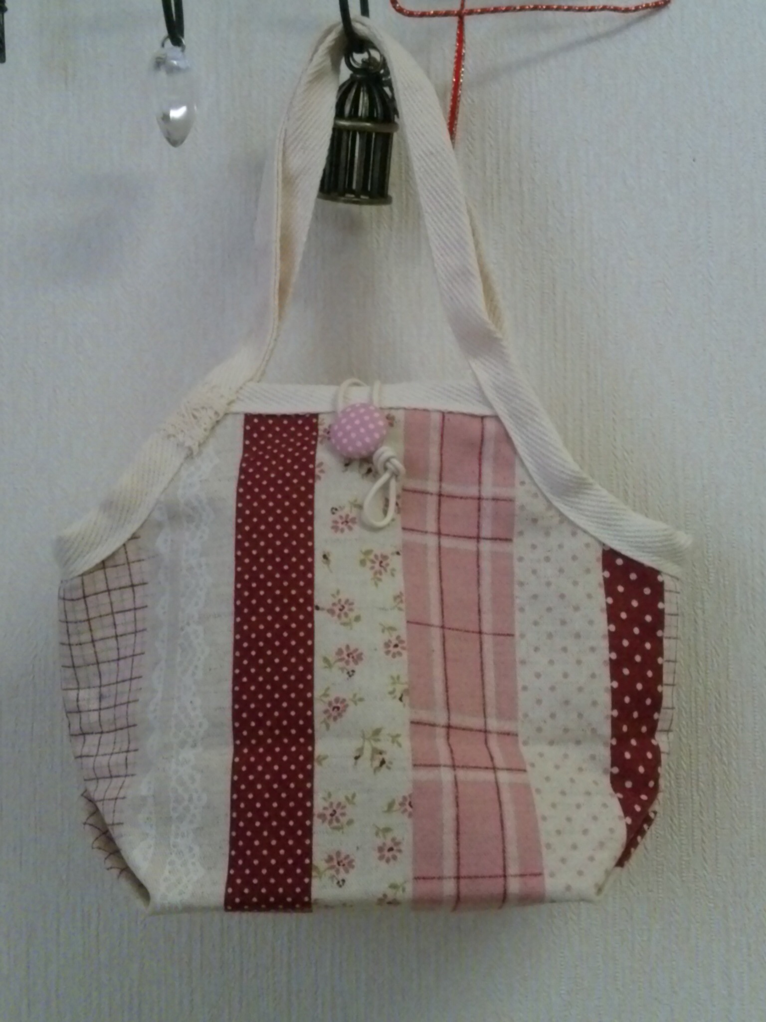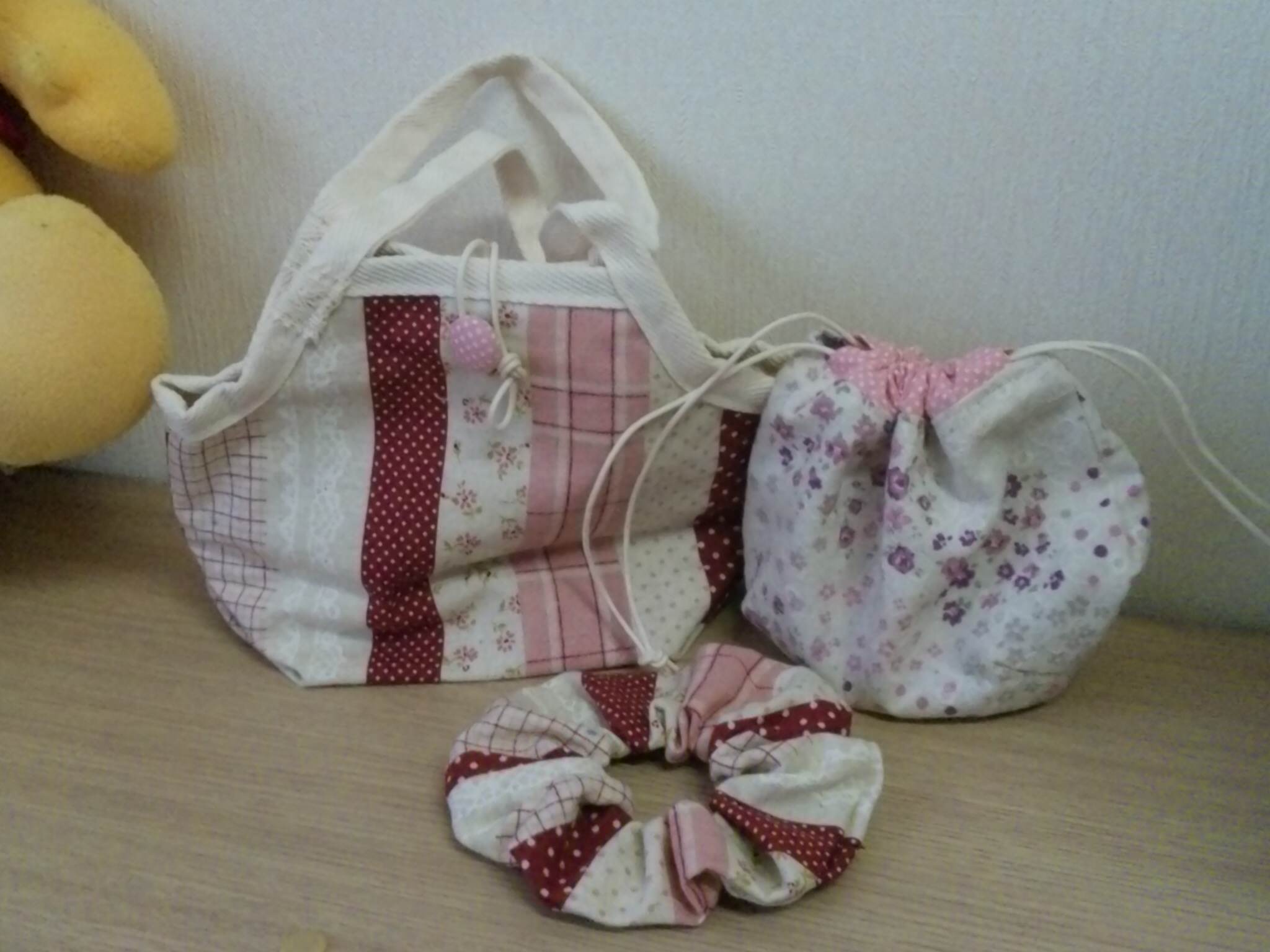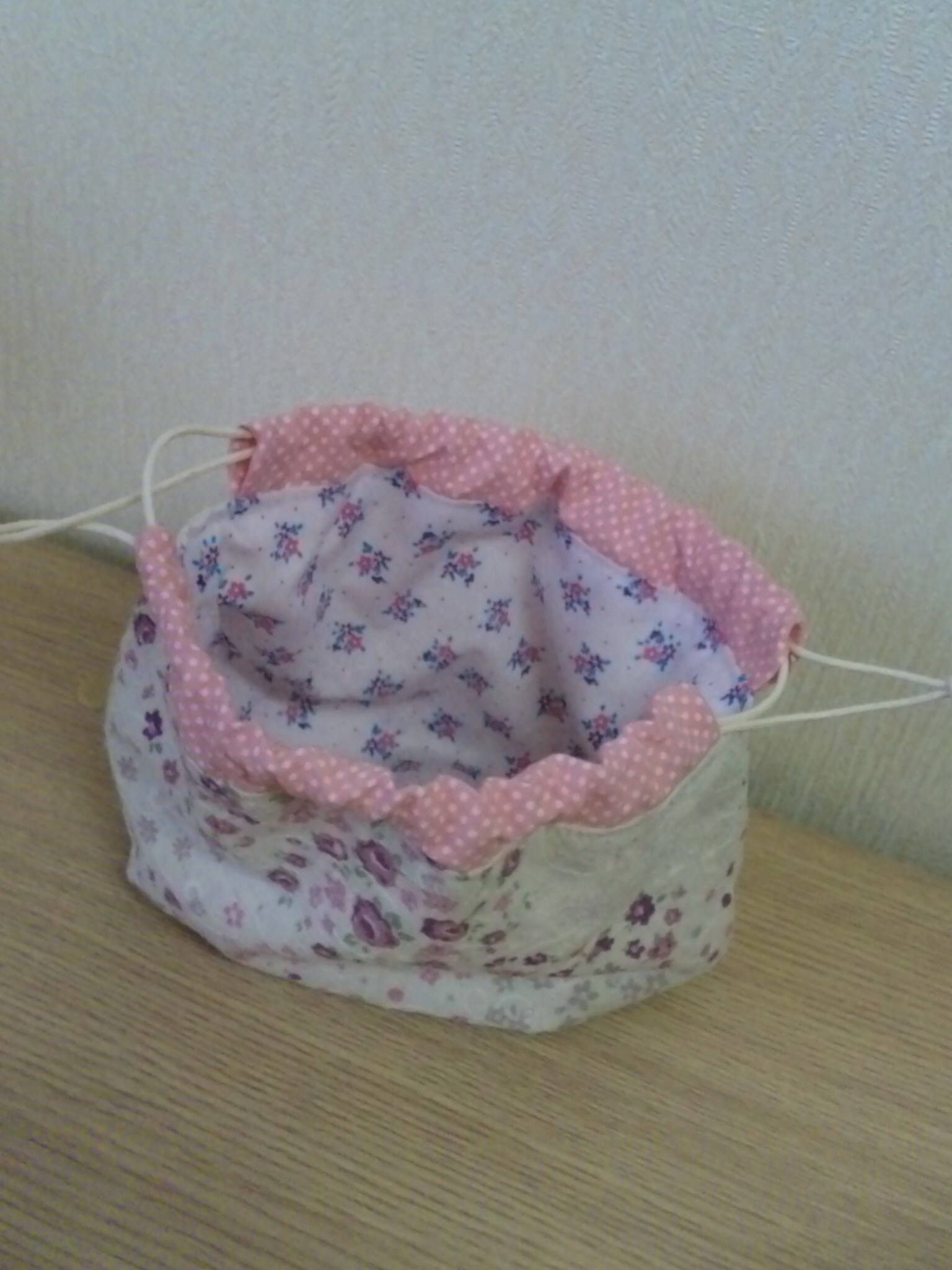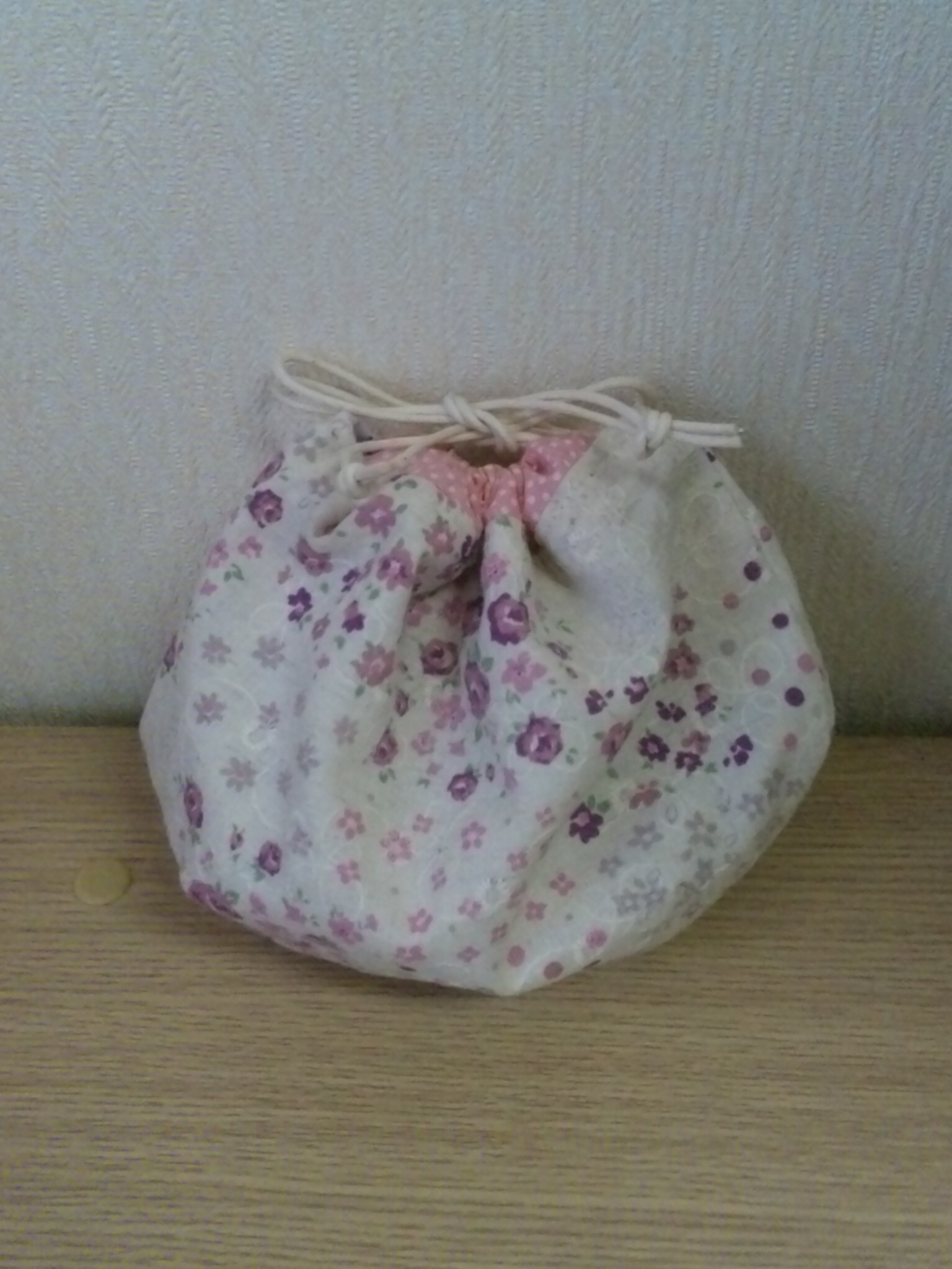 巾着さえ作れなかったので、違う布でやっぱりピンクのガーリーな巾着が完成。