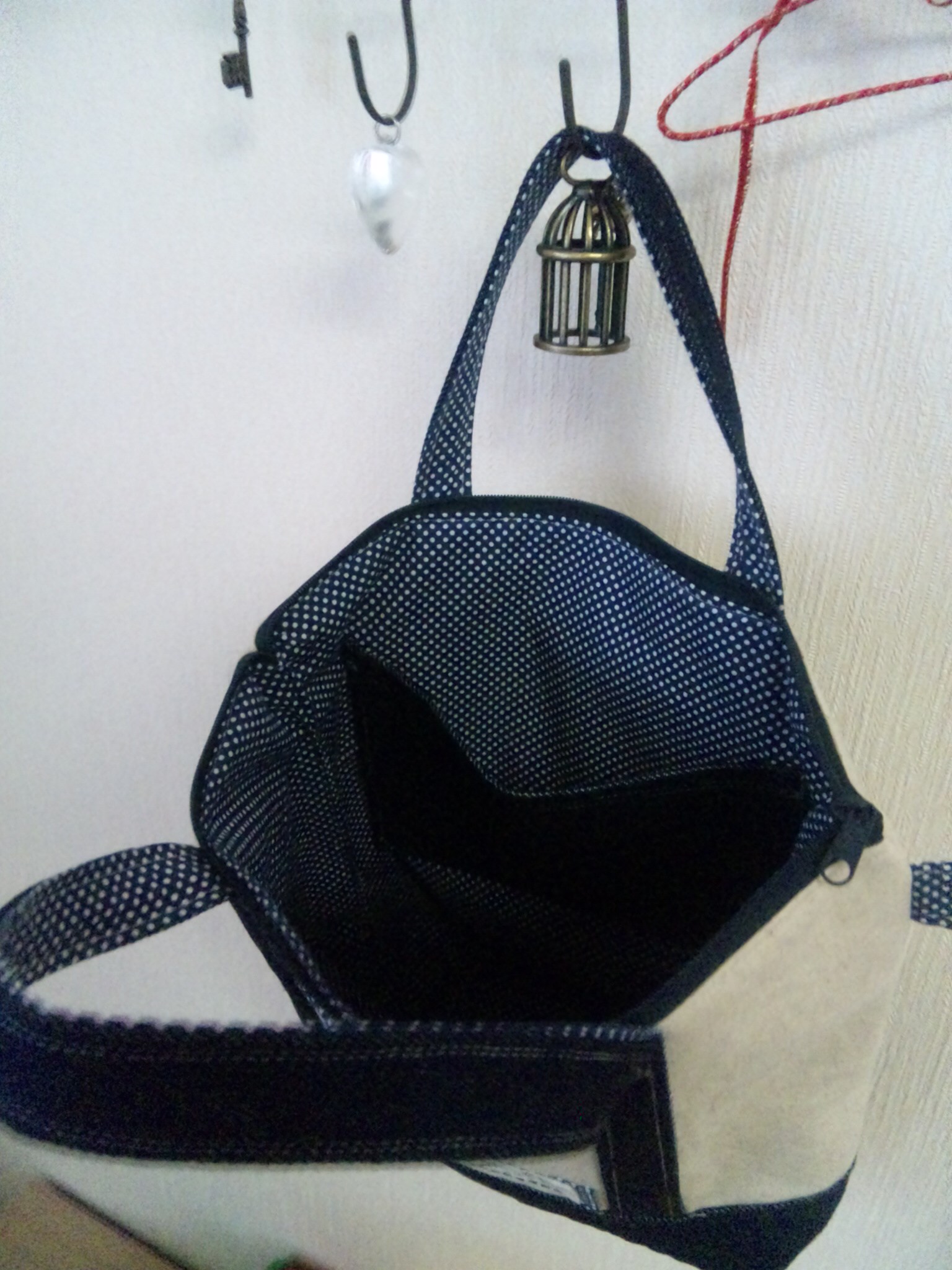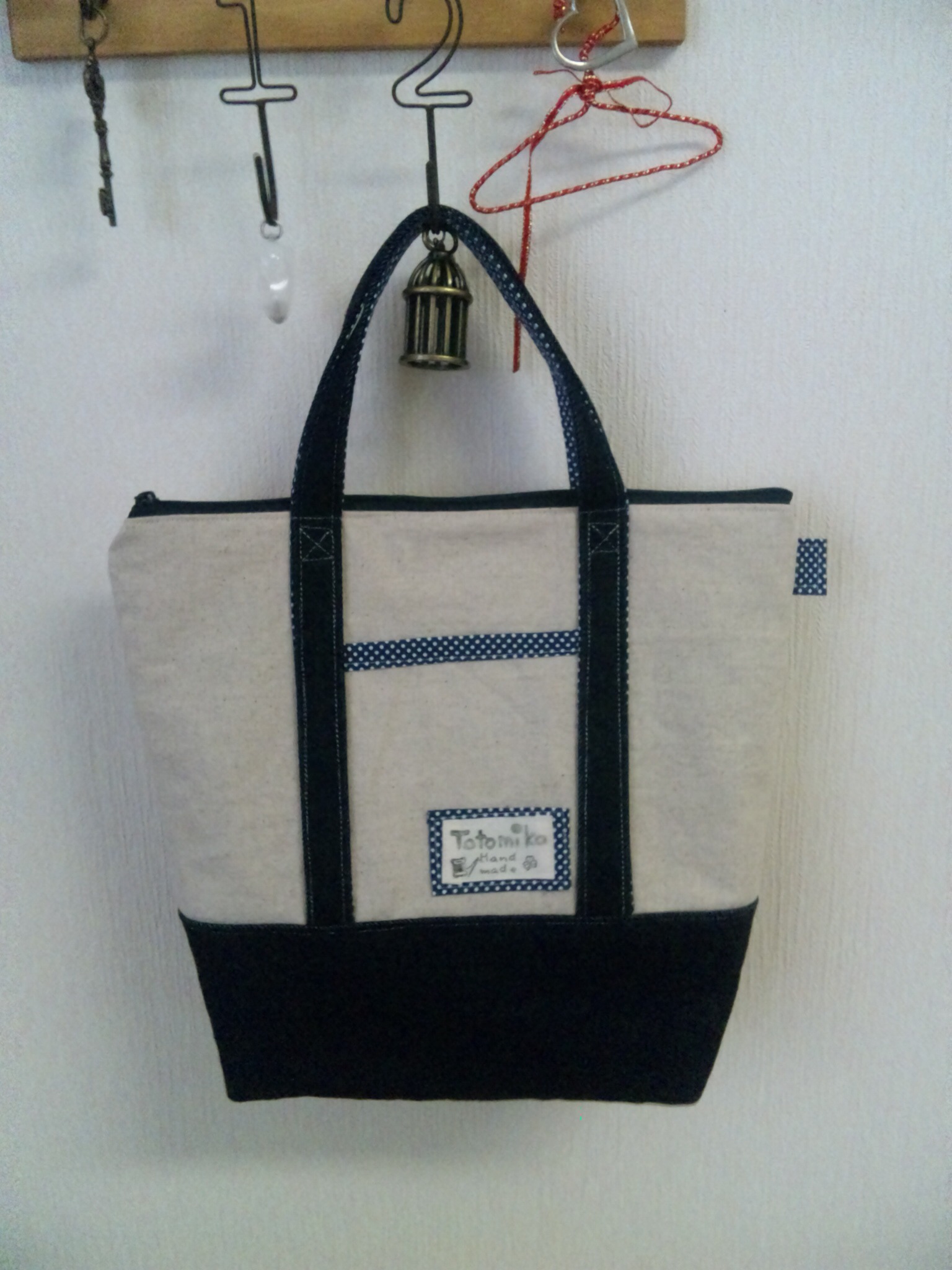 持ち手は前回の点を踏まえてデニムだけでは作らず、裏側は紺のドットにしました。