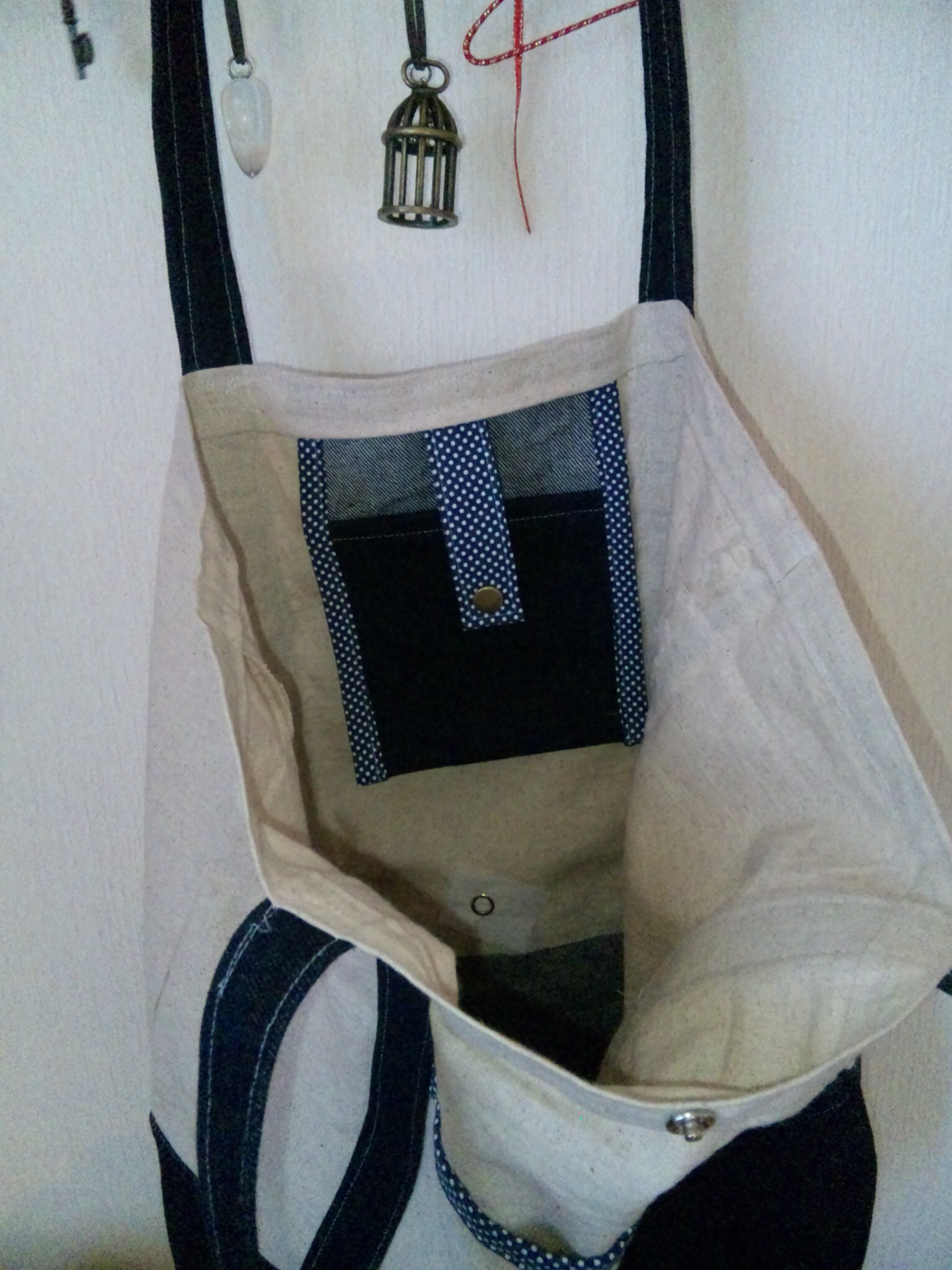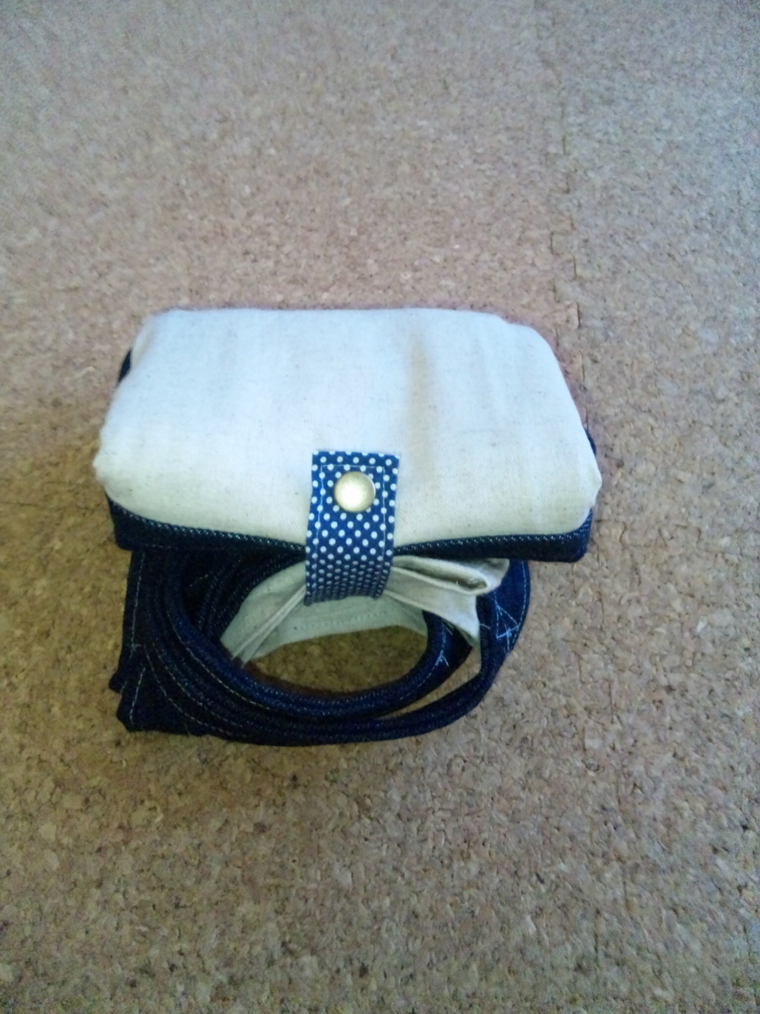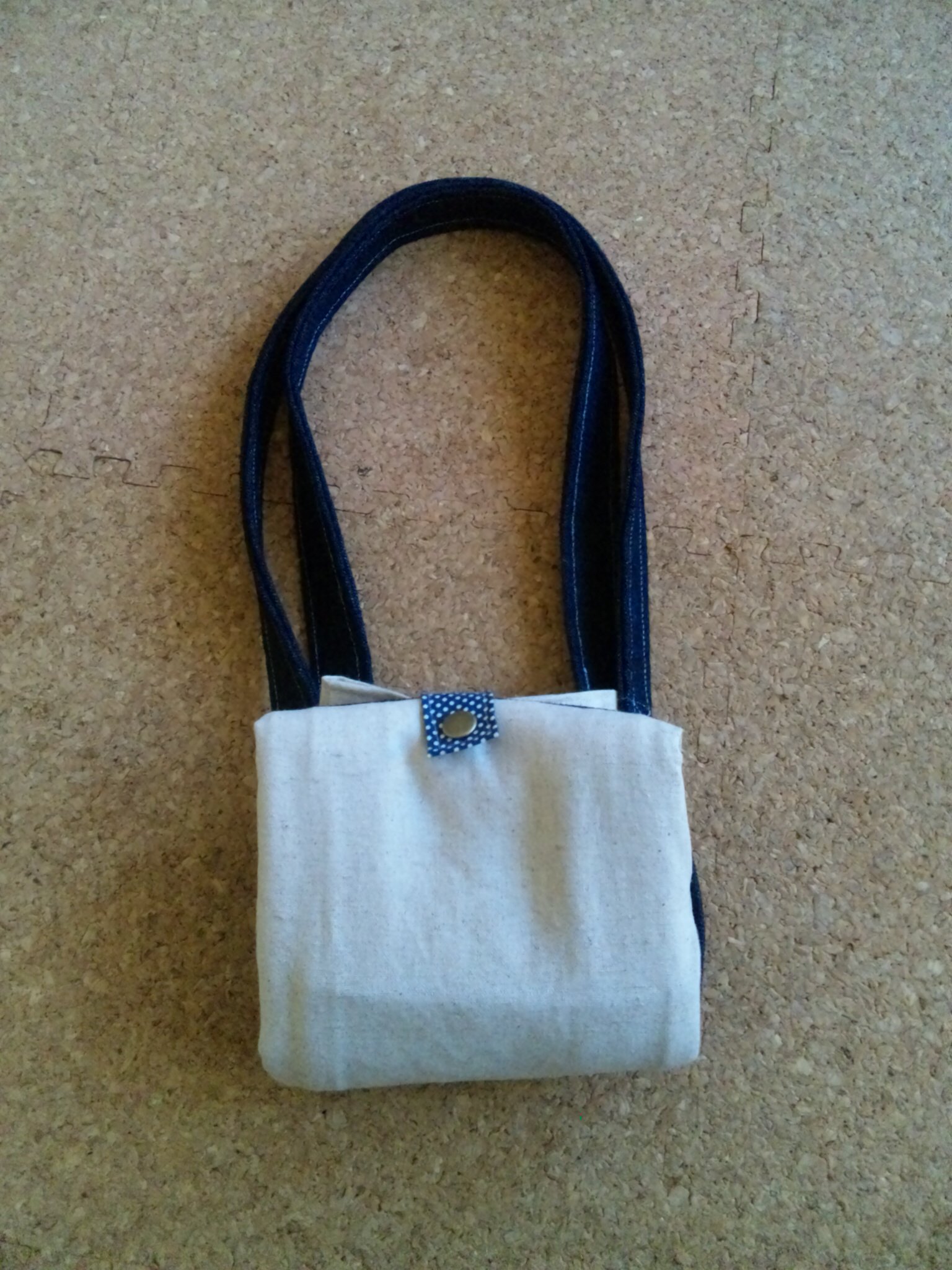 が、持ち手もデニムにしたら思った以上にゴツクなってしまい、一緒に上手に畳めなくなってしまいました(涙