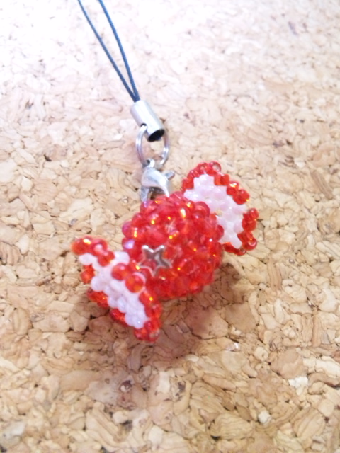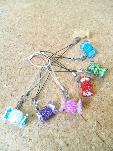 とりあえずビーズのストラップは人気かと思い、あんまり難しくない(って言うか簡単で早くできる)飴ちゃんを作りました。