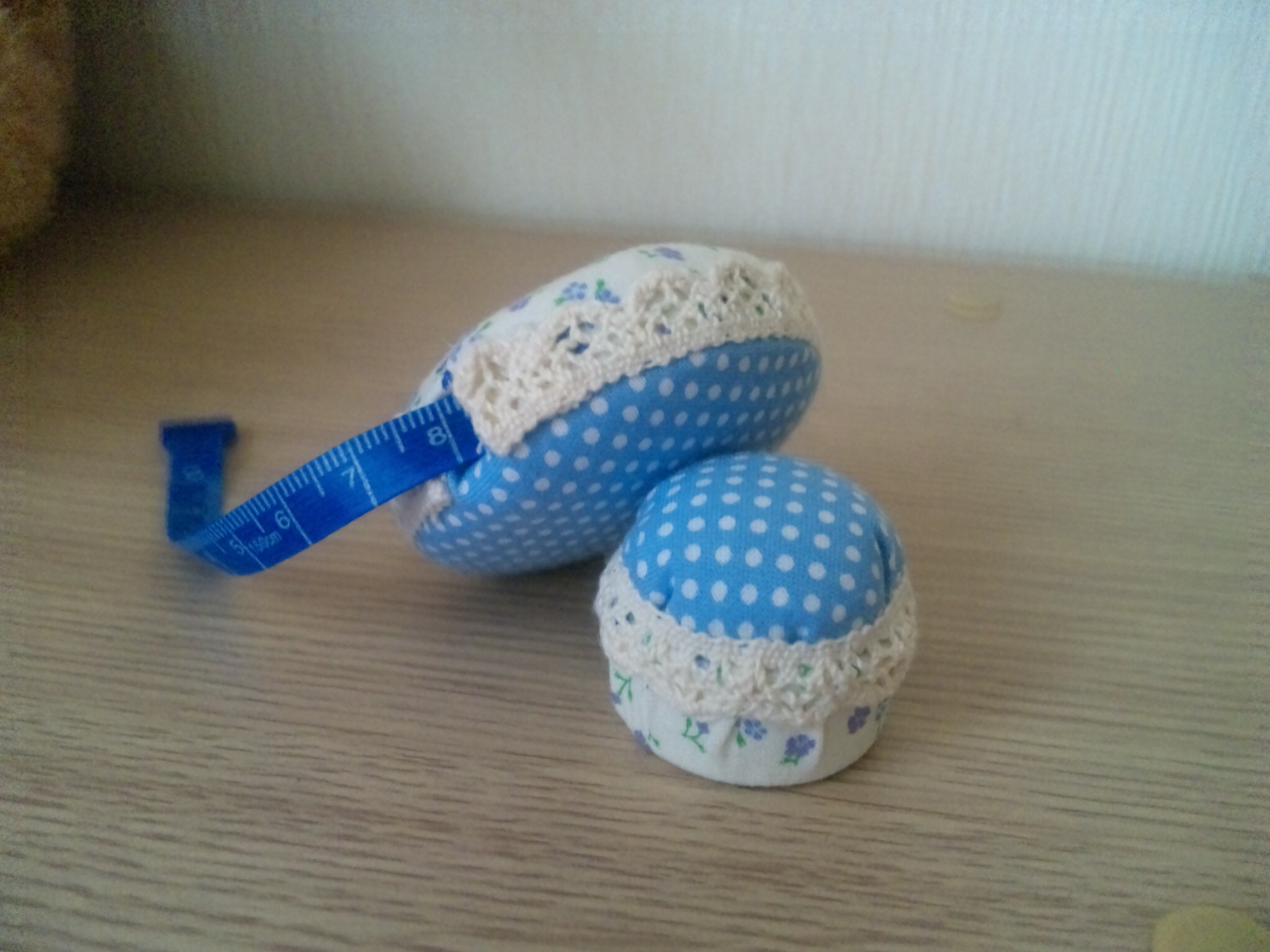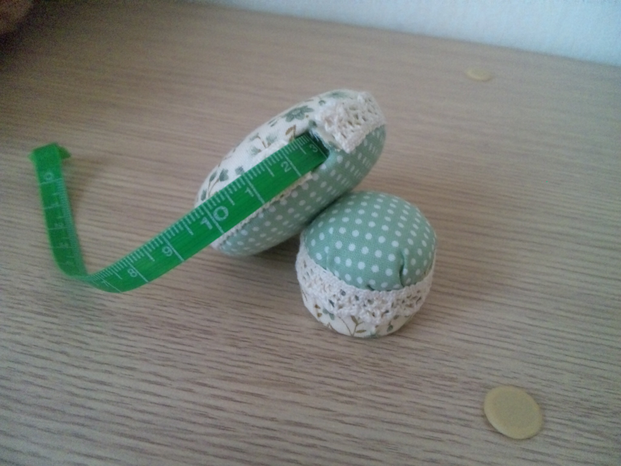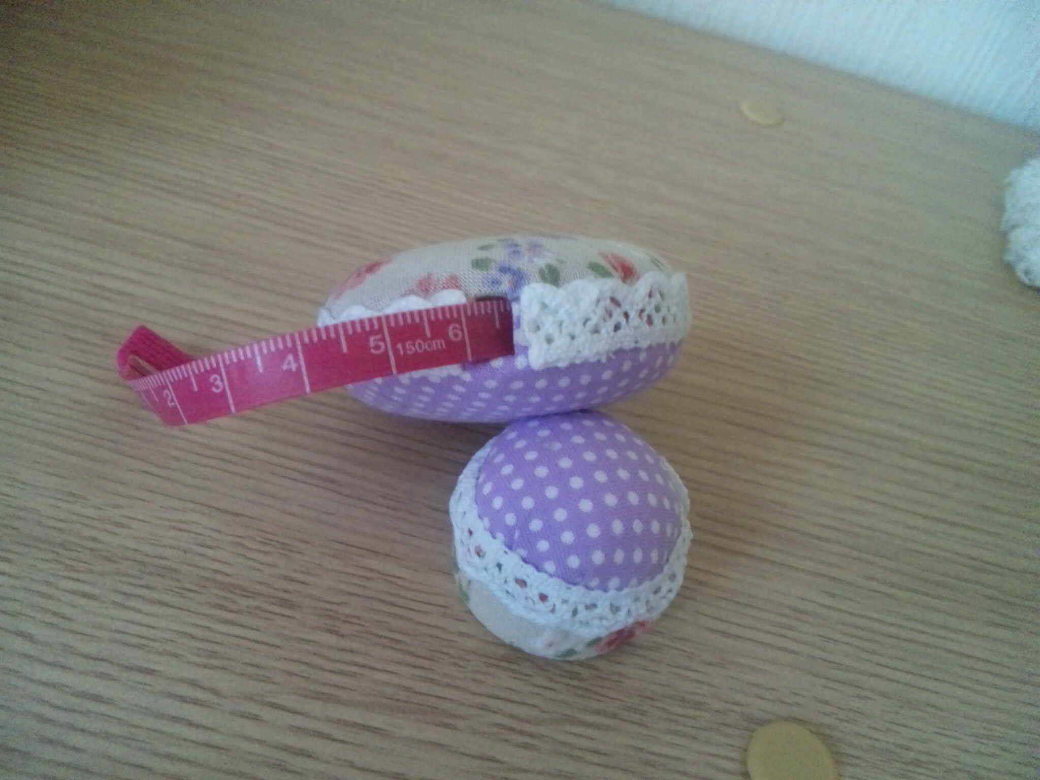マカロンメジャー&ペットボトルのふたピンクッションのお裁縫セット全員集合でございます。