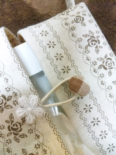 くるみボタンとコードつけて留めれるようにして、コード部分にはお花のワンポイント。