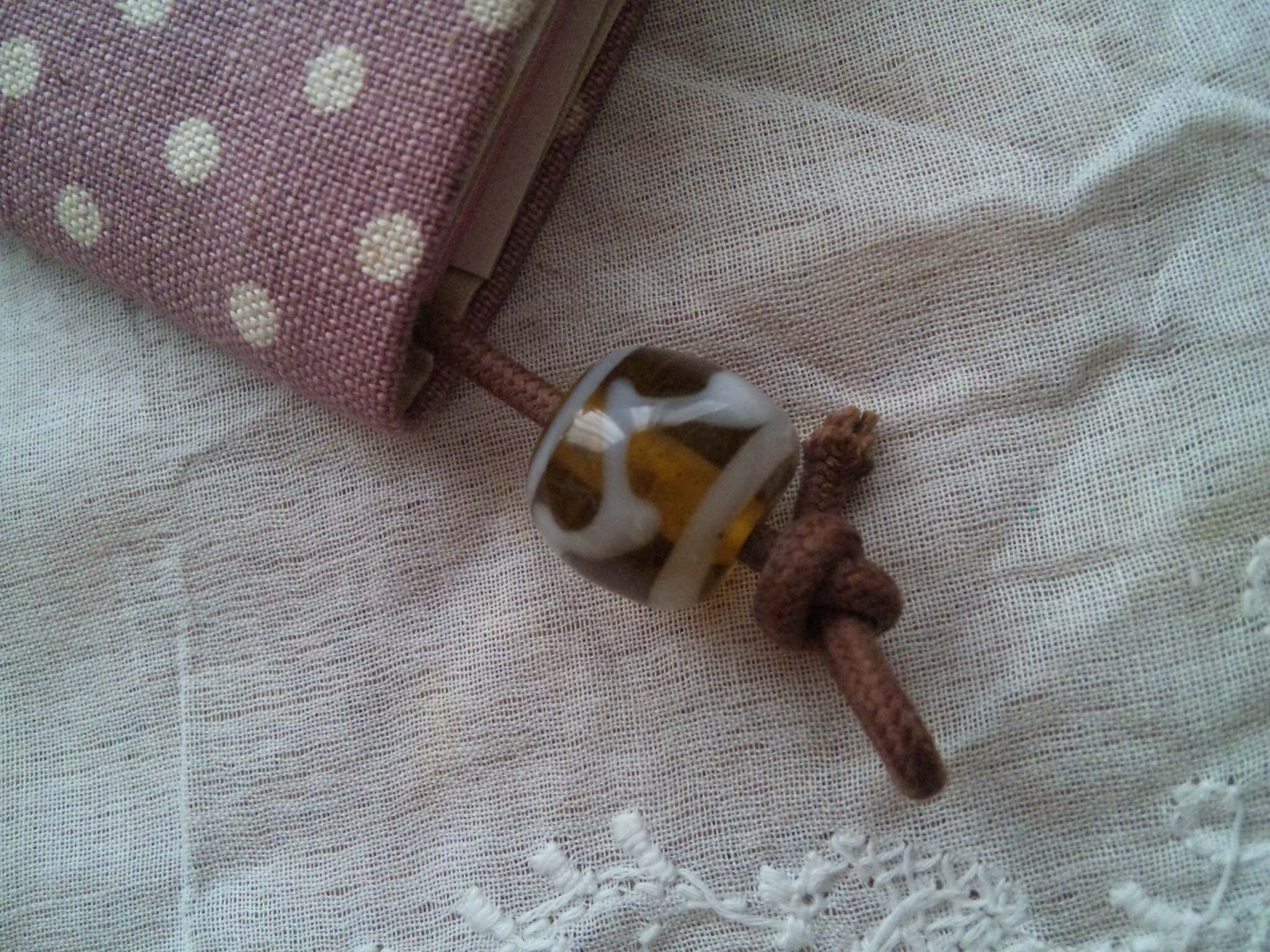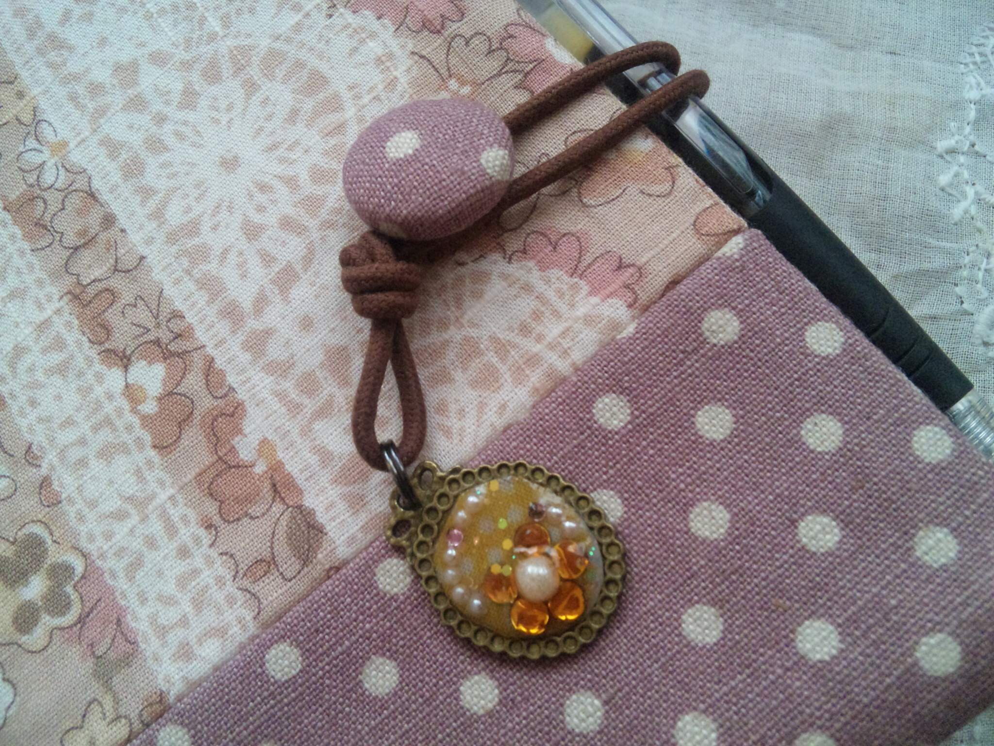 同ドットのくるみボタンに、レジンを通したコード。