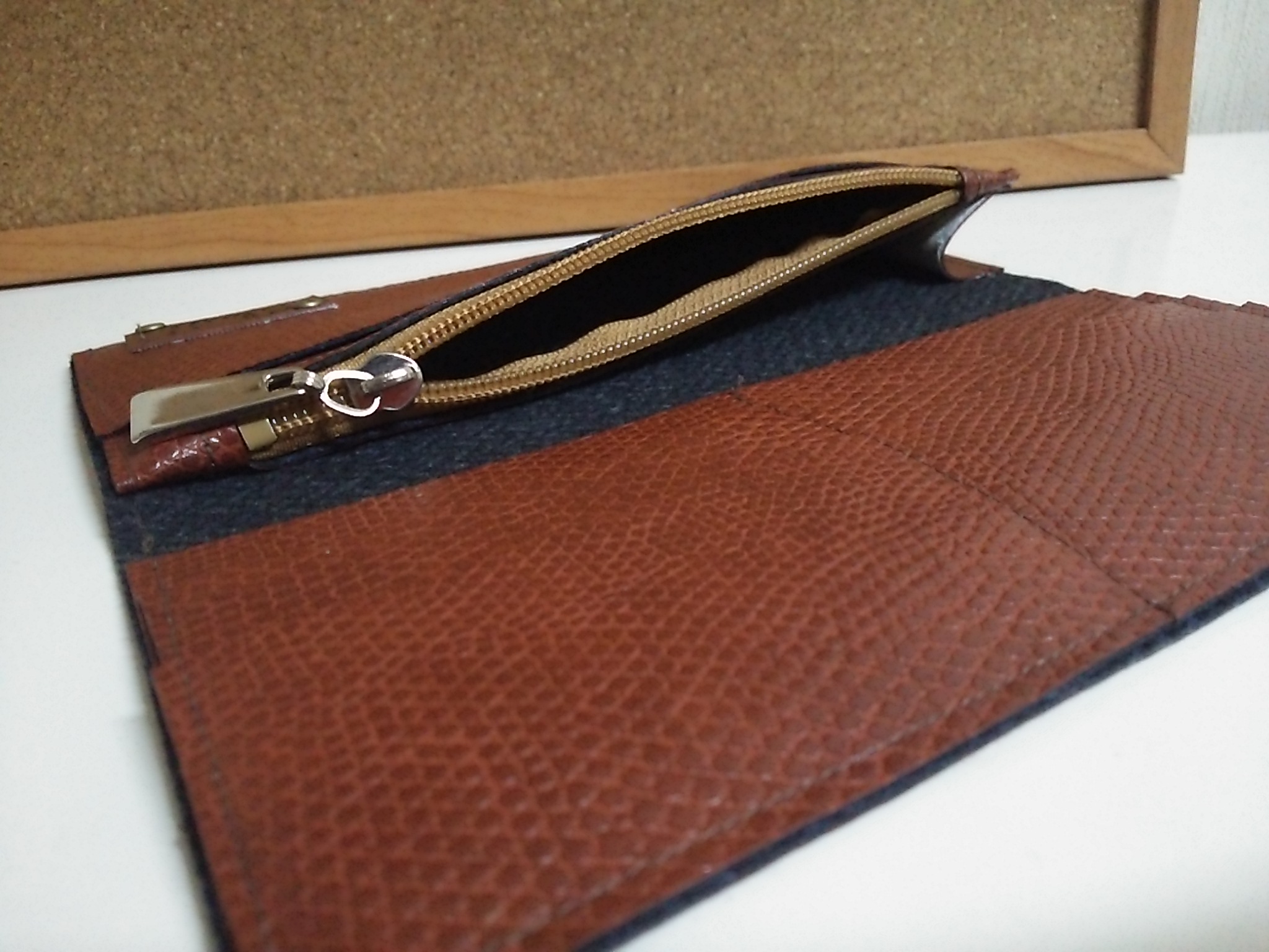 旦那に頼まれていた長財布。途中何度か作ろうと思いつつ、型を考えるのが面倒臭くて放置していたのですが、思い立って急遽作りましたw