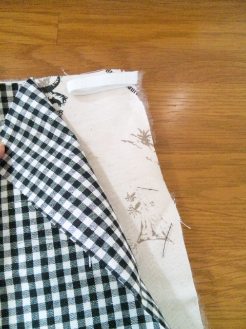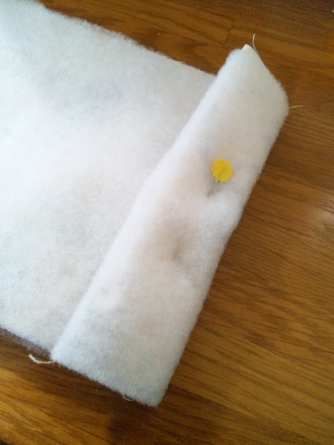 ②キルト芯→表布(上が表)→裏布(下が表)の順に(中表ってやつ)の順に乗せ、両脇を縫います。
