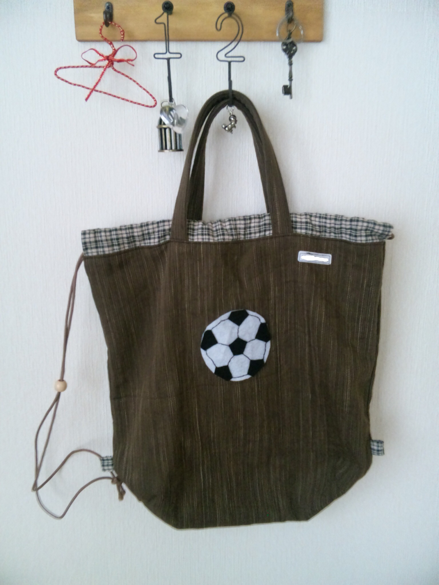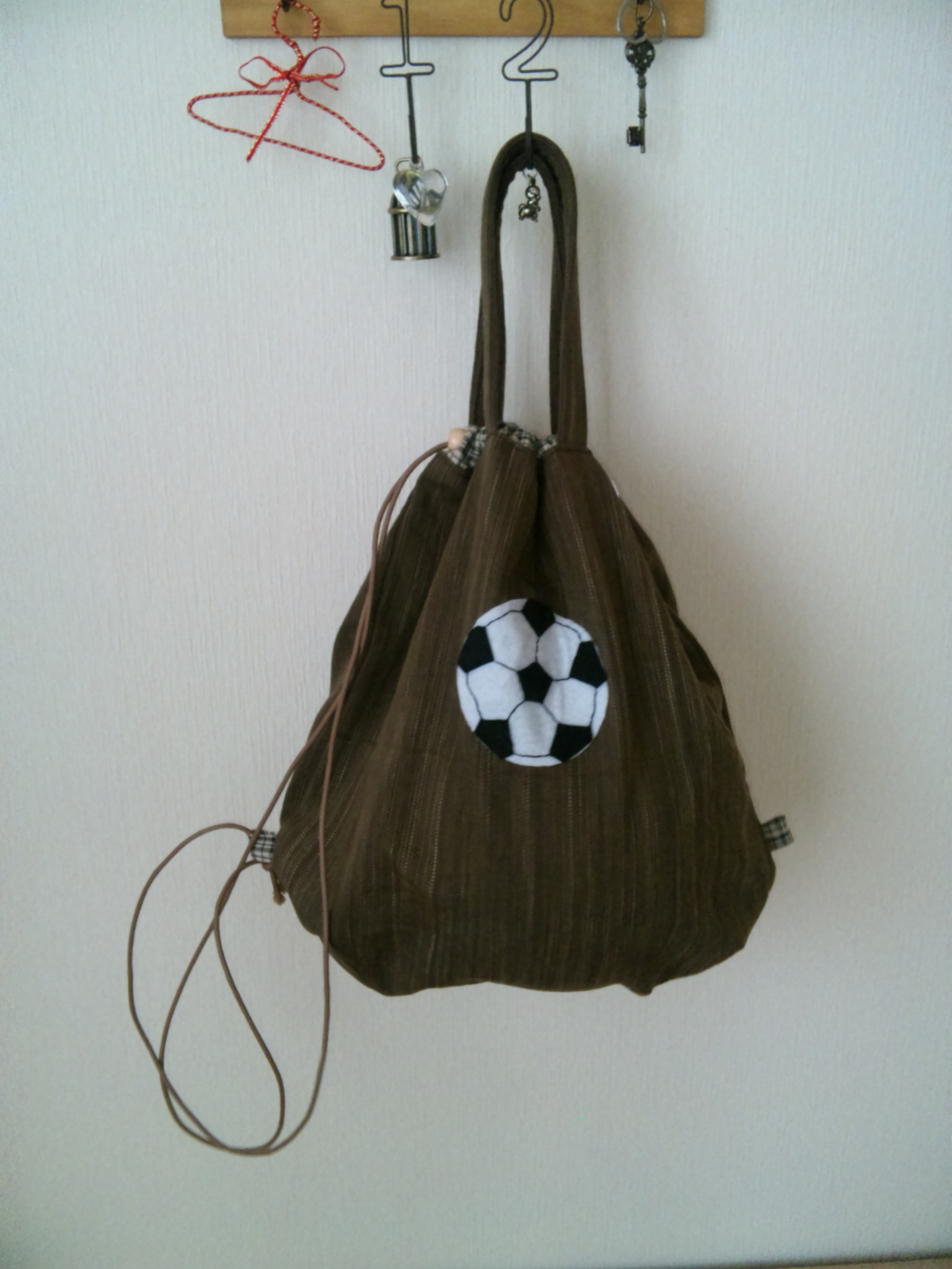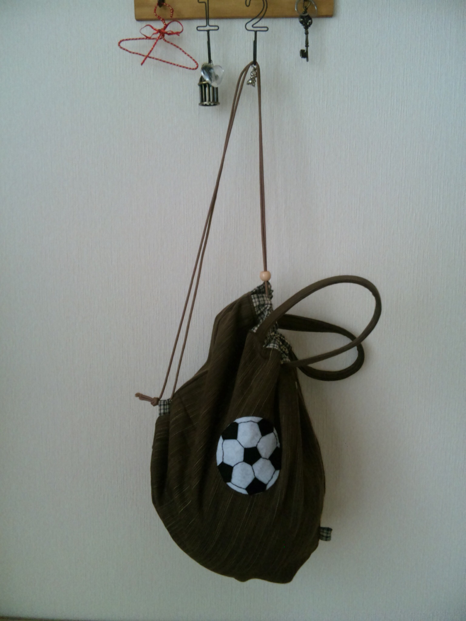 最初左右に紐通してナップサックにしたら、ぼうずに「どうやって持つの?」と突っ込まれちゃいました。