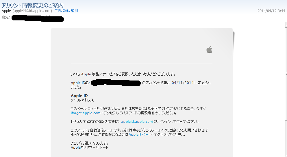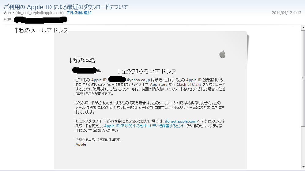 その次のメールは「ご利用の Apple ID による最近のダウンロードについて」