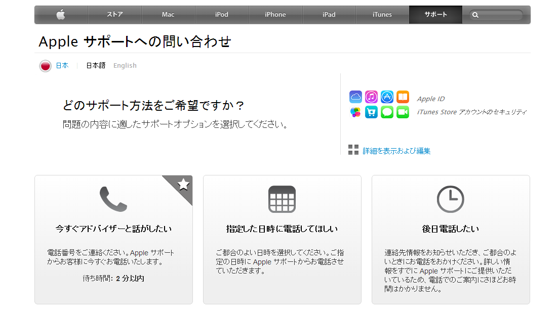 「AppleのHP」→「サポート」→「お問い合わせ(こちらから)」→「ここからスタート」→「その他の製品とサービス」→「Apple ID」→「その他のApple IDに関するトピックス」→「iTunes Storeアカウントのセキュリティ」です。