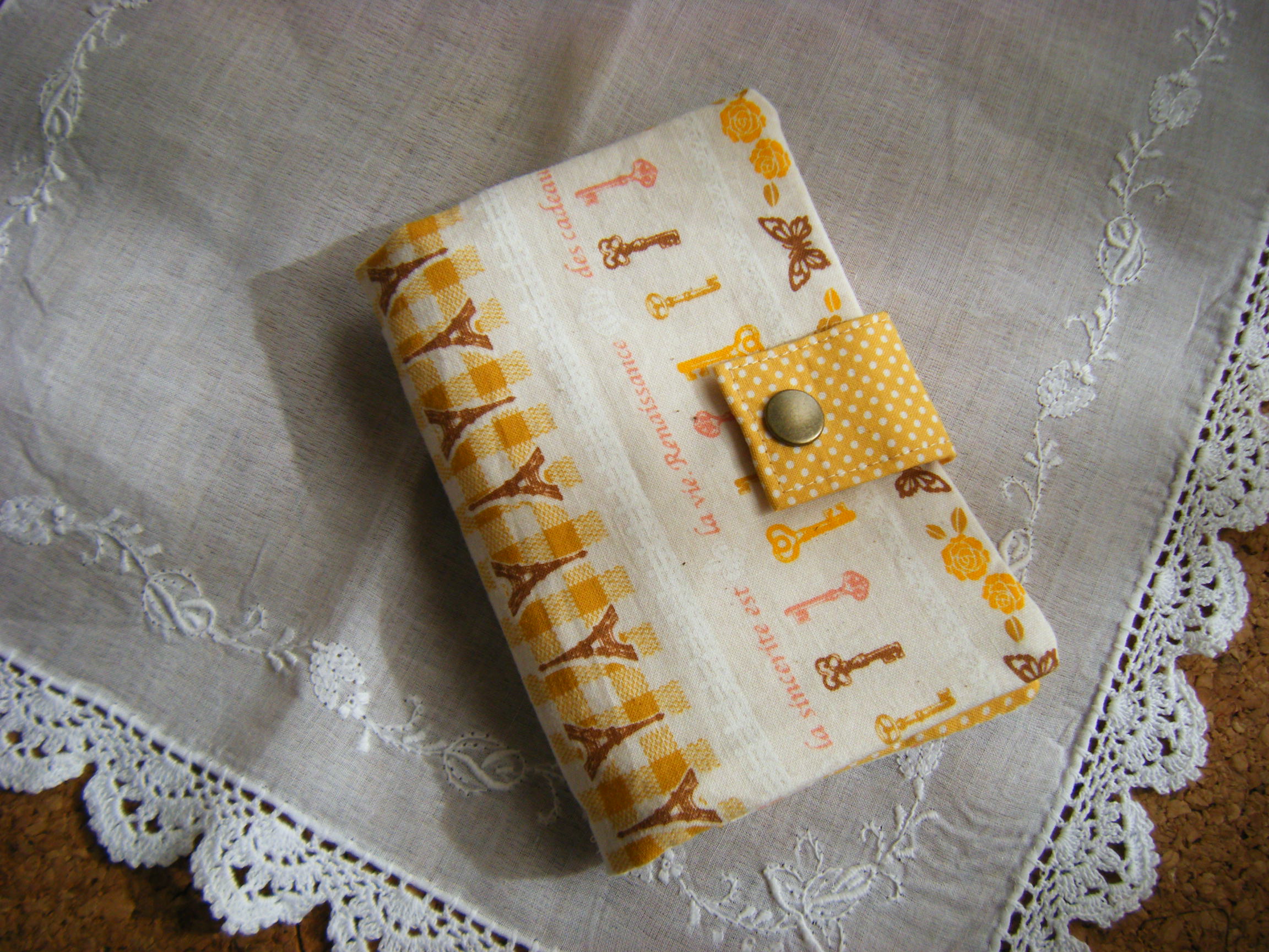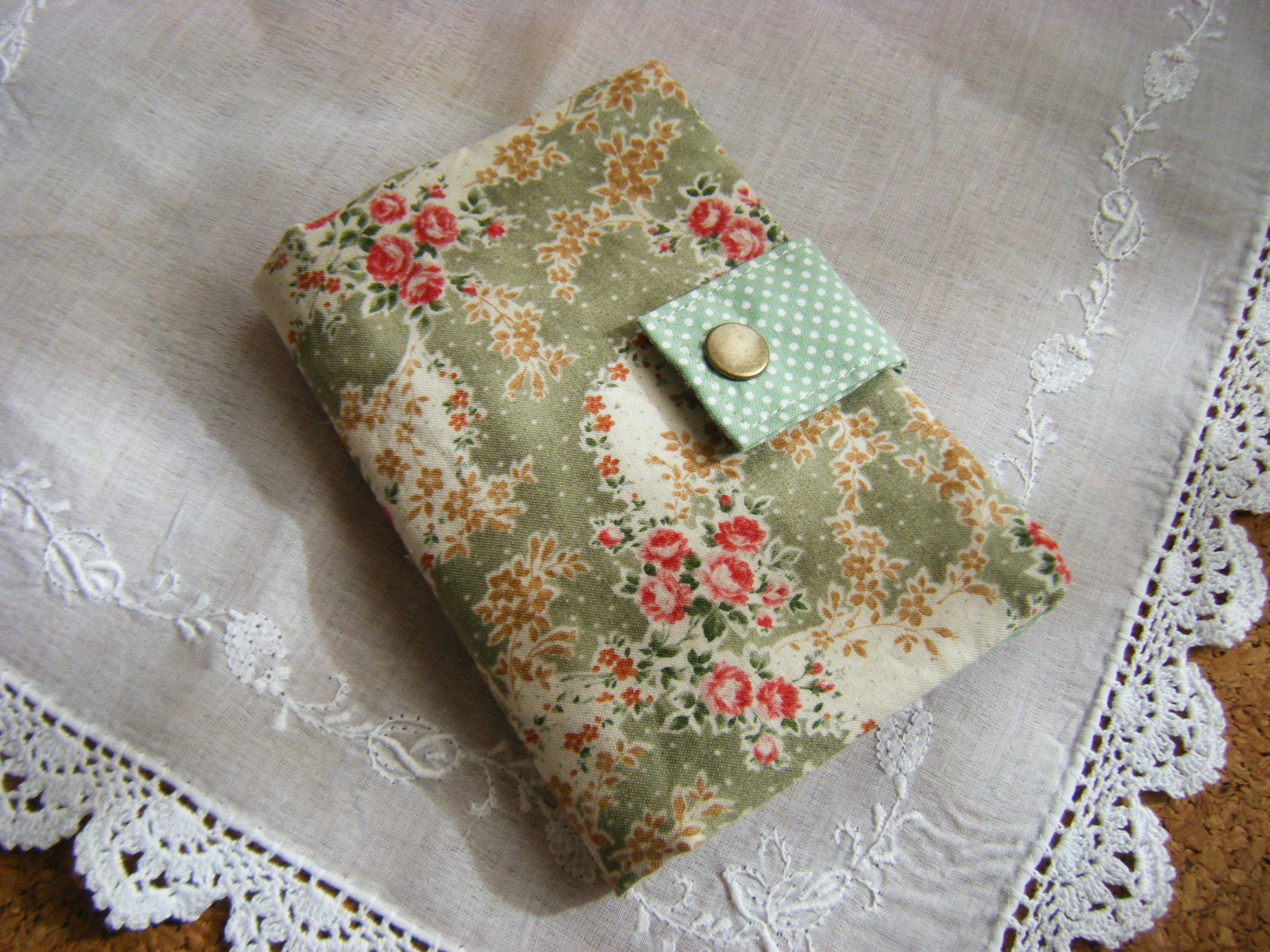 表布ベージュ色の花柄コットン。表布切替部分こげ茶色のドット柄コットン。中布は少ししっかりとした綿麻のこげ茶無地生地となっております。